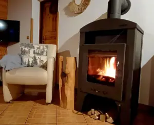 V přízemí vás přivítá útulný obývací pokoj s krbovými kamny, které rozehřejí celý dům.