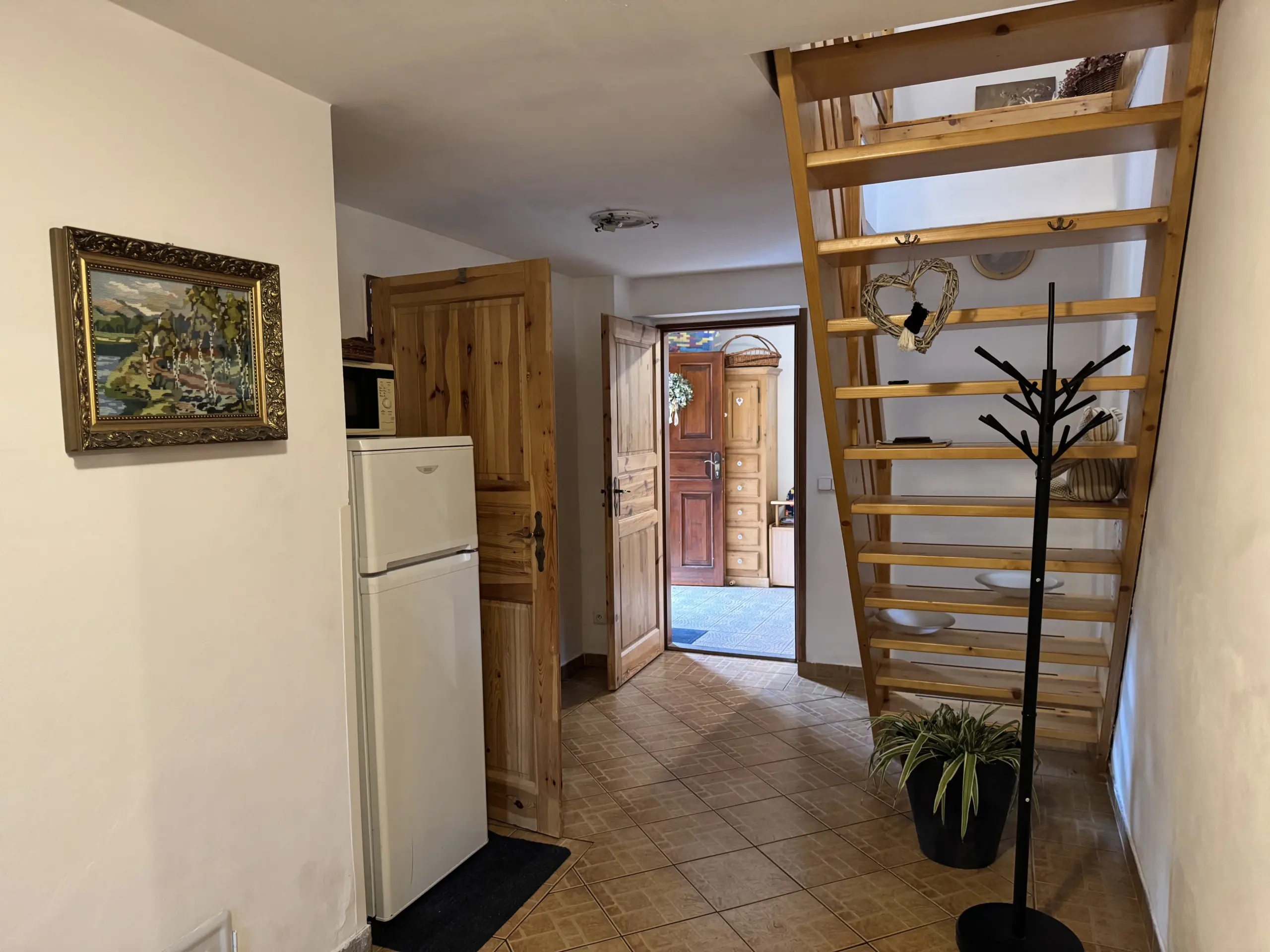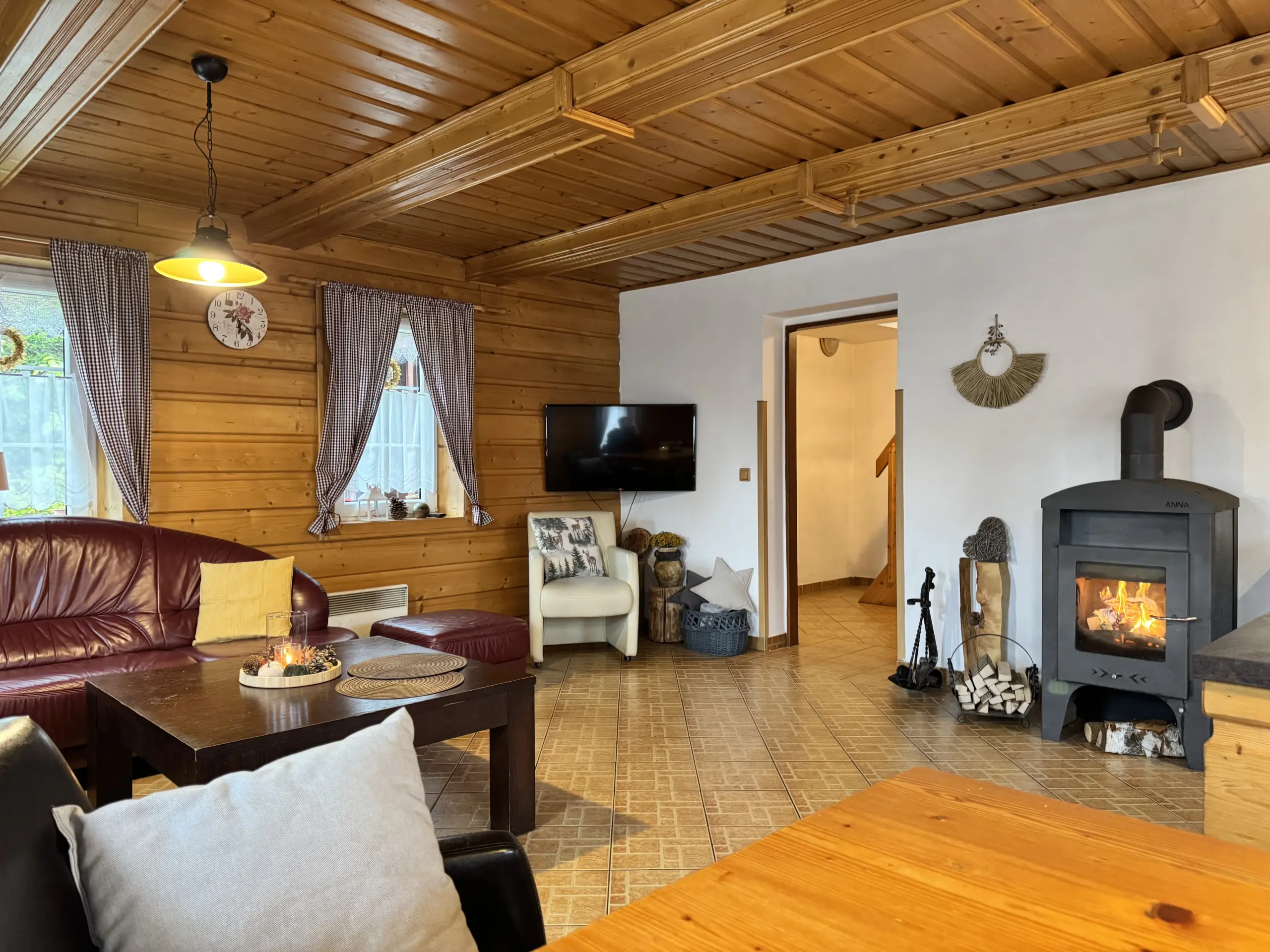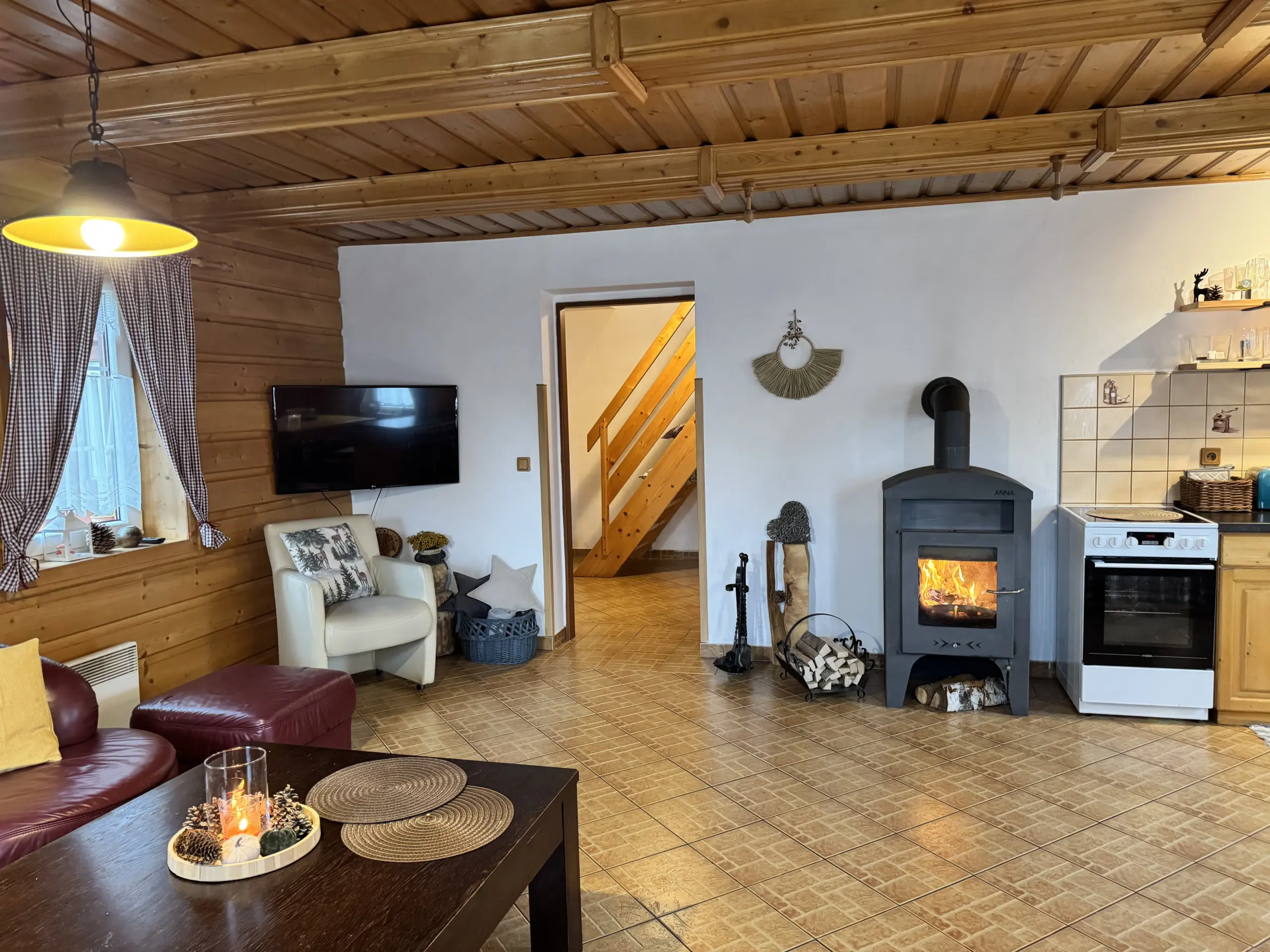 V přízemí vás přivítá útulný obývací pokoj s krbovými kamny, které rozehřejí celý dům.